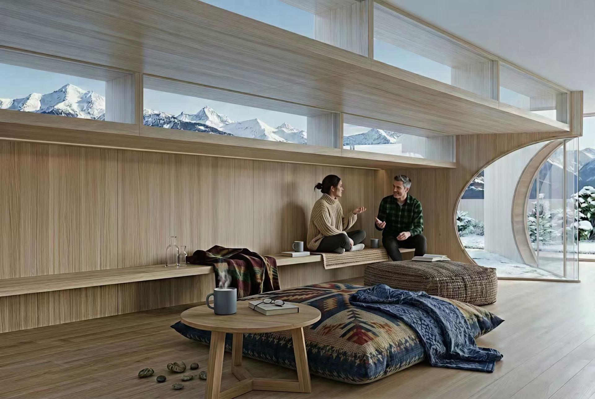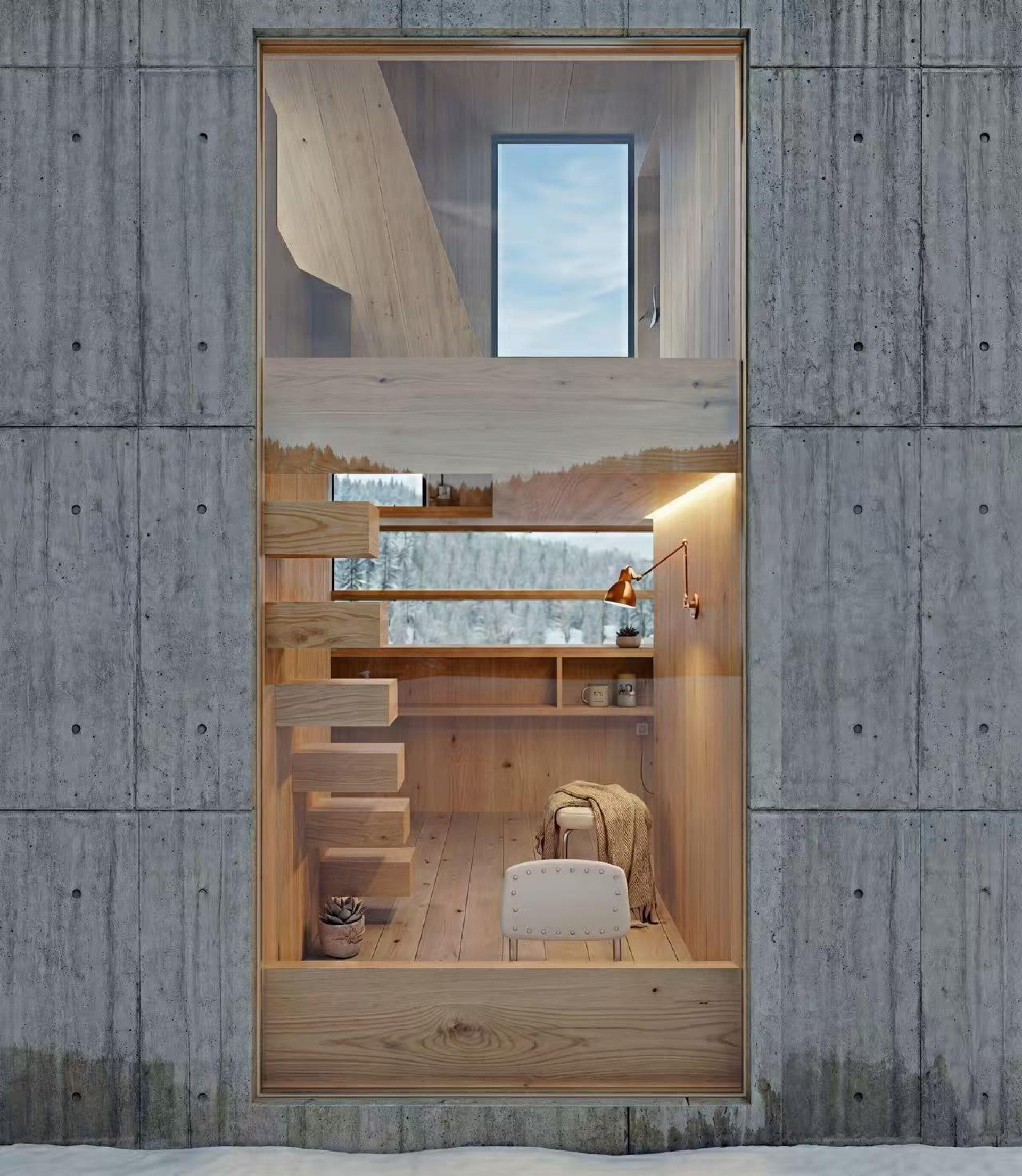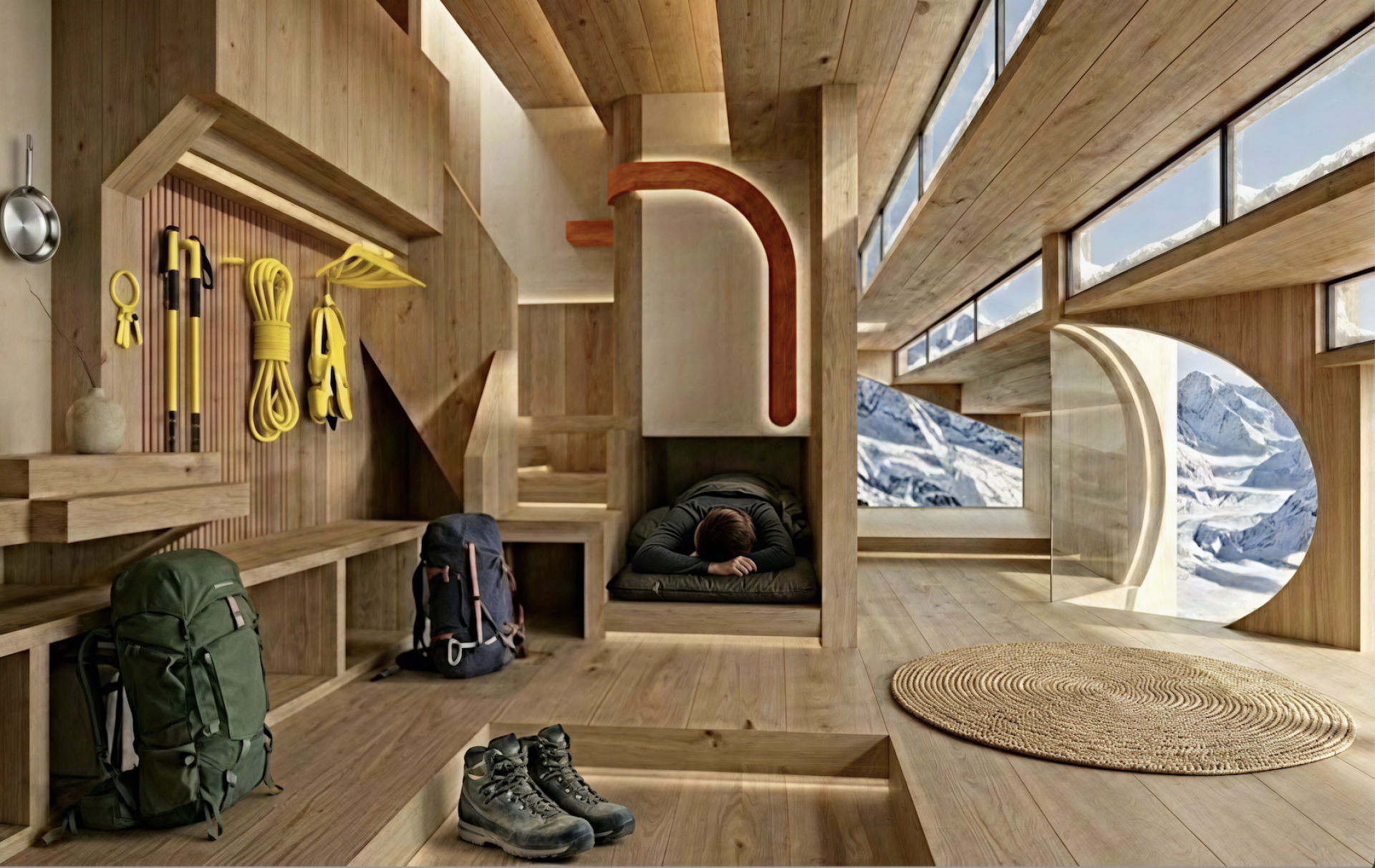 The architectural form is generated from a stepped roof that functions both as enclosure and viewing terrace, allowing climbers to rest, gather, and observe the surrounding mountains. Interior sleeping platforms are integrated into the structural system, reducing material use while maximizing spatial efficiency. The building is elevated without permanent foundations and designed to be relocated after several years, allowing the original site to recover naturally.