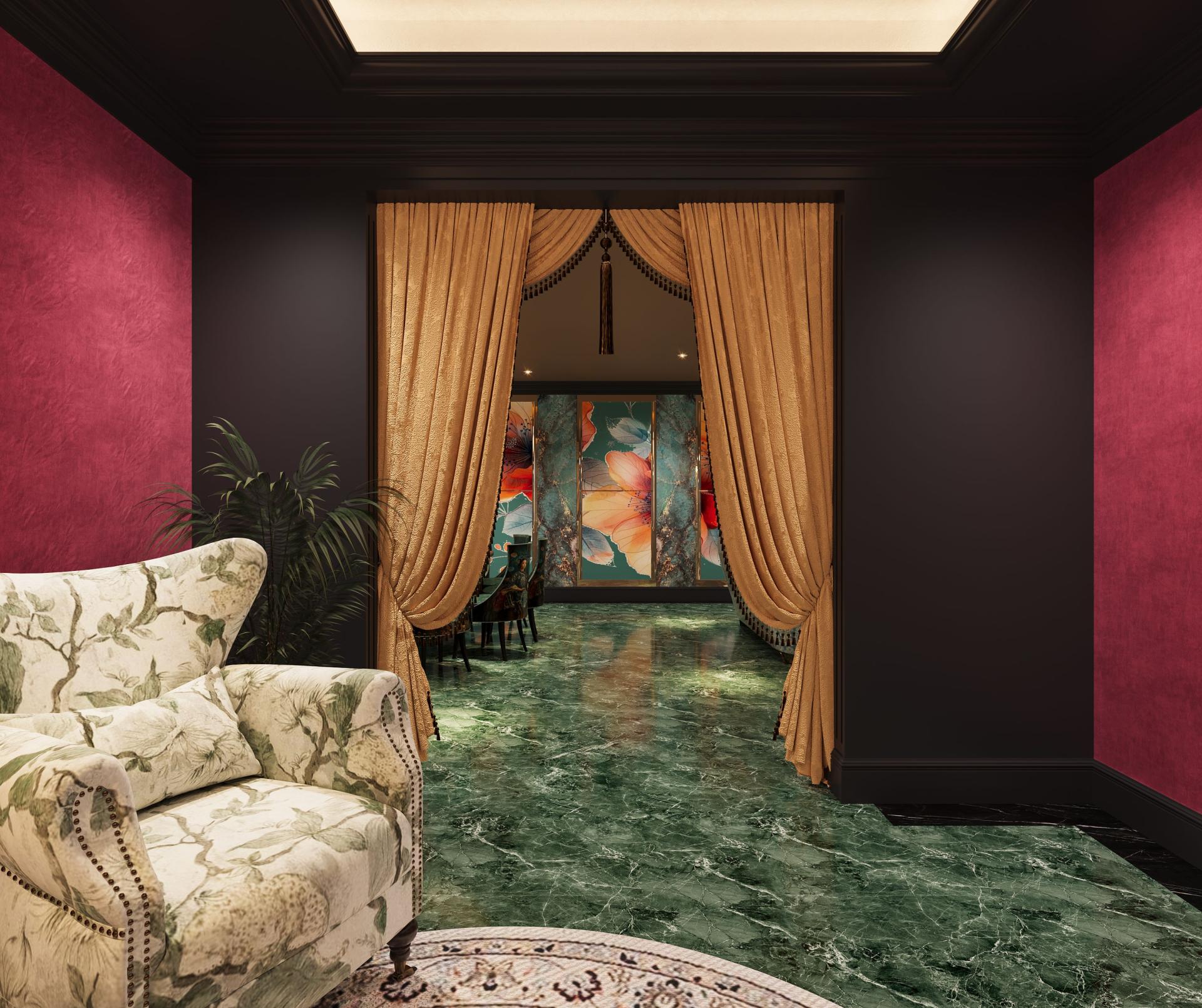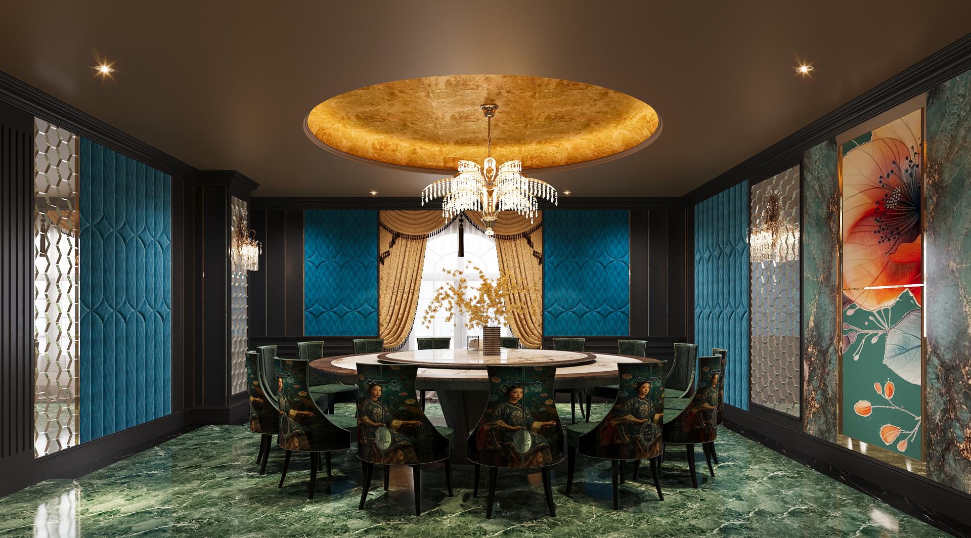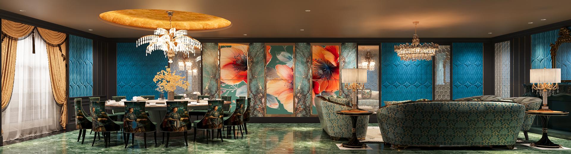 Inspired by the celebrated drama “Blossoms Shanghai”, this private dining suite reimagines the glamorous spirit of 1990s Shanghai—a city of romance, ambition, and fleeting encounters. At the entrance, golden drapery opens like a stage curtain, flanked by crimson and ebony walls that set a theatrical tone. The emerald marble floor shimmers with gravitas, while peacock-blue upholstered walls form a lavish backdrop. Monumental floral panels symbolize both prosperity and impermanence, echoing the series’ layered narratives of human desire and fragile destiny.