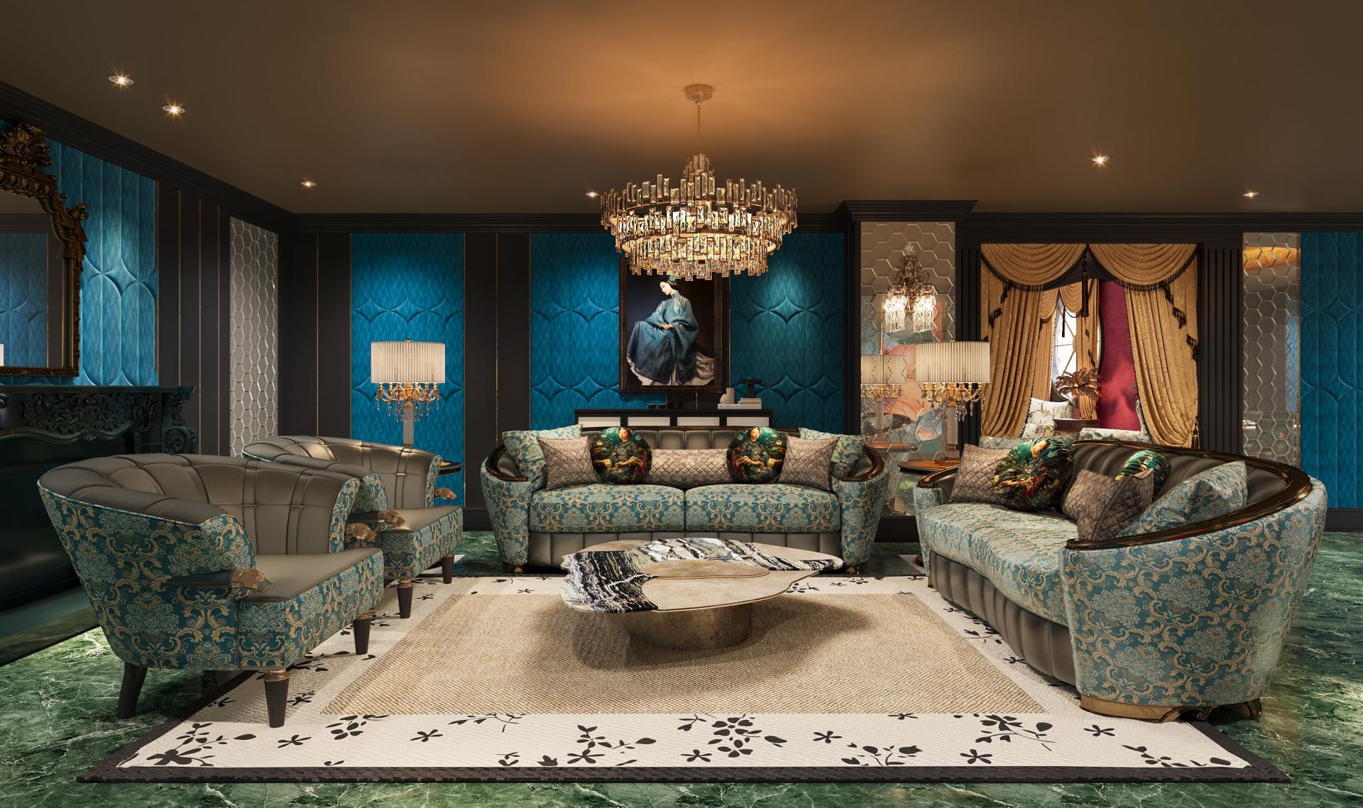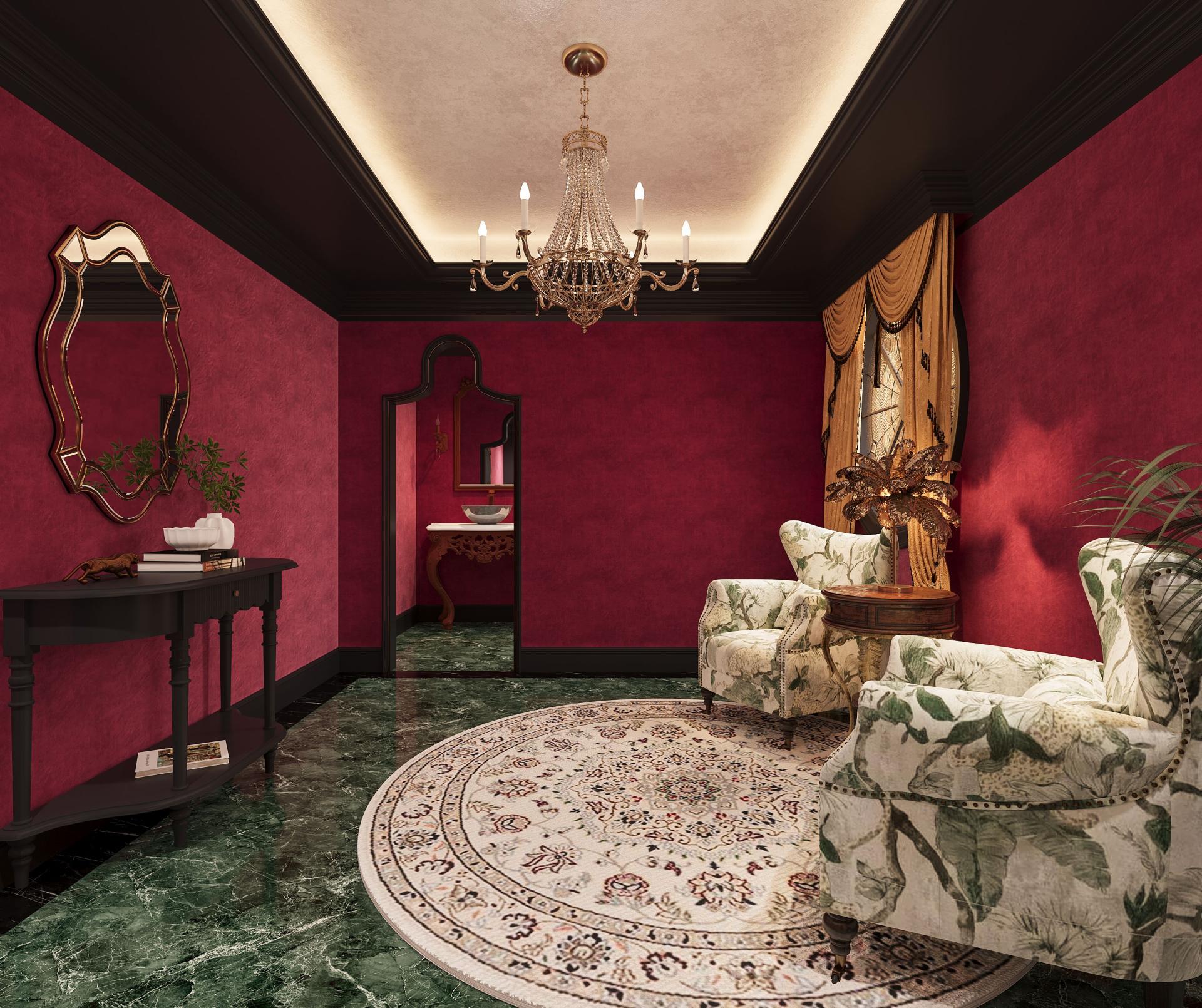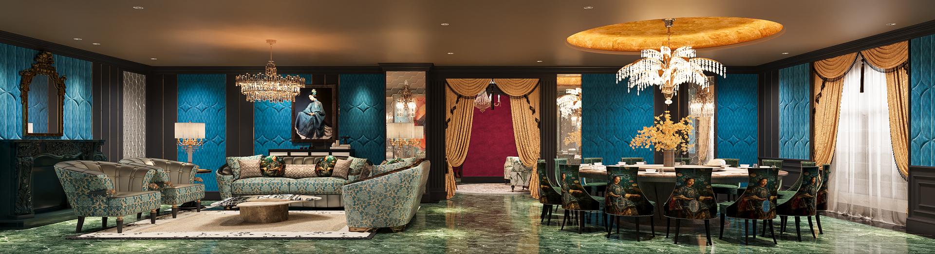 Inspired by the celebrated drama “Blossoms Shanghai”, this private dining suite reimagines the glamorous spirit of 1990s Shanghai—a city of romance, ambition, and fleeting encounters. At the entrance, golden drapery opens like a stage curtain, flanked by crimson and ebony walls that set a theatrical tone. The emerald marble floor shimmers with gravitas, while peacock-blue upholstered walls form a lavish backdrop. Monumental floral panels symbolize both prosperity and impermanence, echoing the series’ layered narratives of human desire and fragile destiny.